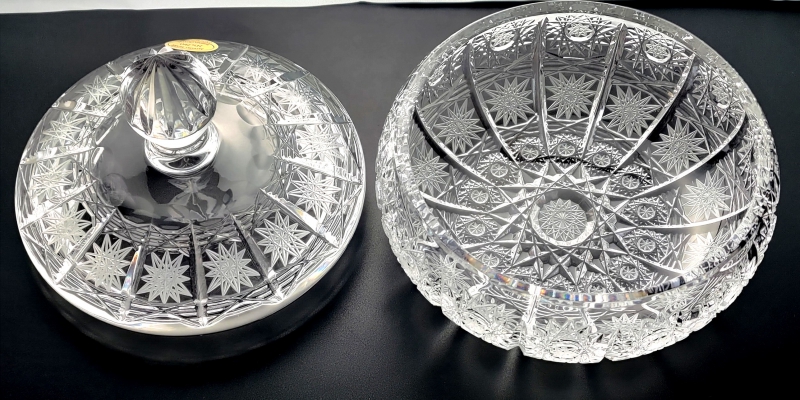 Ručně broušená a foukaná dóza z pravého českého křišťálu min. 24 % PbO. Luxusně baleno v modrém saténu s nápisem BOHEMIA CRYSTAL.