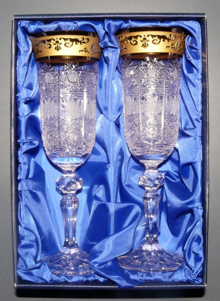 Luxusní broušené skleničky na sekt zdobené zlatem jsou vyrobeny z pravého českého křišťálu min. 24% PbO.Ojem 150 ml. Baleno v modrém saténu s nápisem BOHEMIA CRYSTAL.