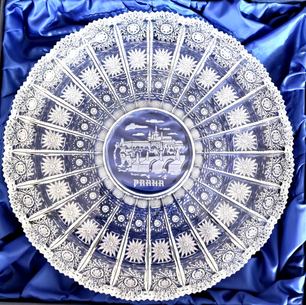 Luxusní ručně broušený talíř z pravého olovnatého křišťálu min. 24 %PbO s vypískovaným motivem PRAHA. Dárkově baleno v krabičce se saténovou výstelkou.